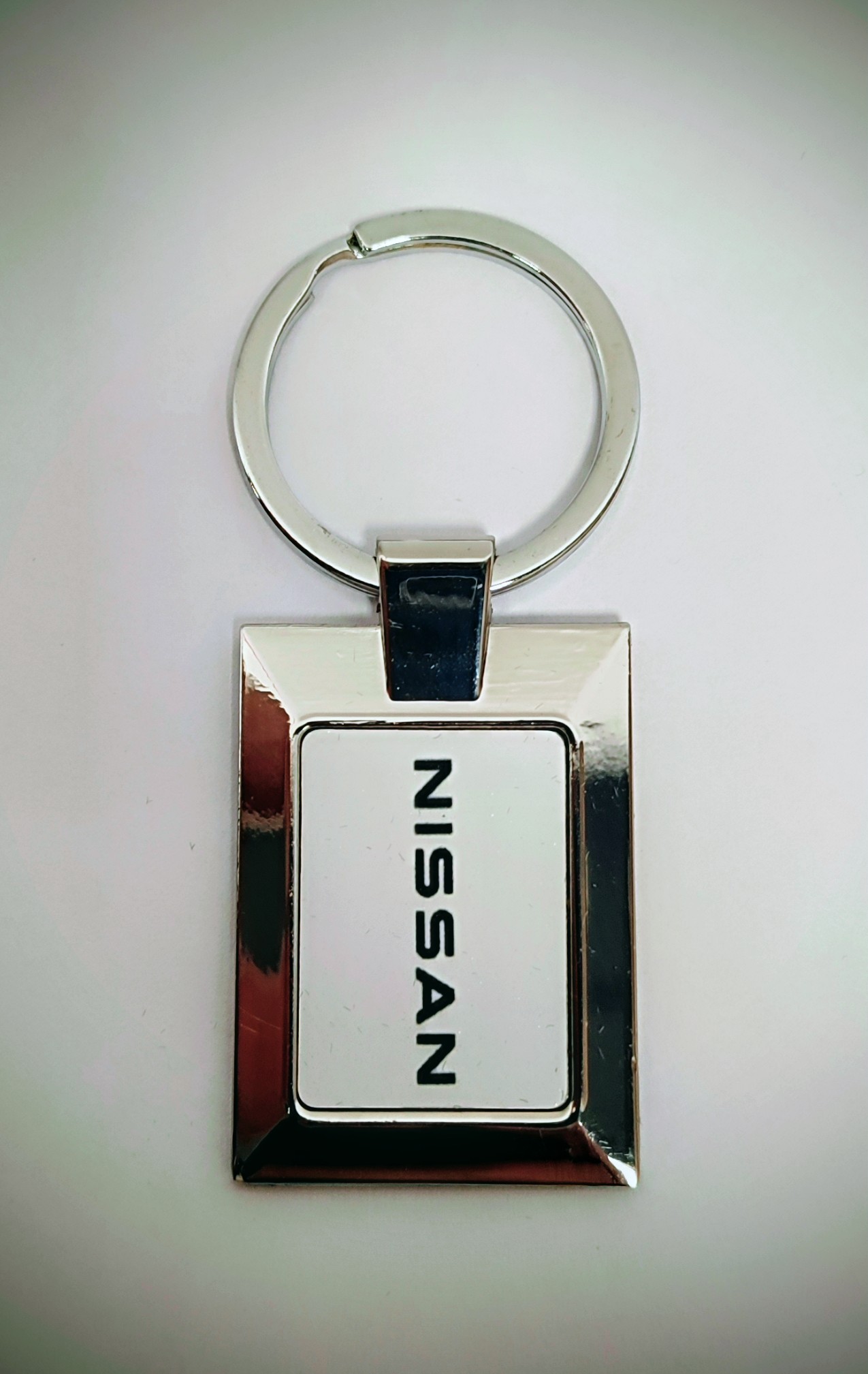 Брелок Nissan, в коробці прямокутний із заокругленими сторонами білий металевий, 38*20 мм
