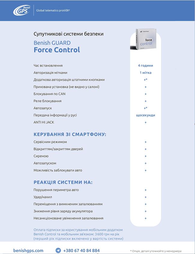 - Автосигналізація Benish Guard Force Control. Абонплата 300 грн/міс з 2-го року користування - купуйте аксесуар у будь-який час.
